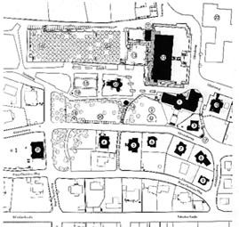 芸術家村マチルデンの丘の現在 1、E.ルードビック ハウス(ユーゲントシュテイ−ル博物館) 3、オルブリッヒ邸 4、ベーレンス邸 5、グルッカート ハウス1 6、グルッカート ハウス2 11、結婚記念塔 12、展覧会場 23、ロシヤ教会 24、プラタナス公園 |